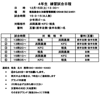 12月15日(土)4年生練習試合日程